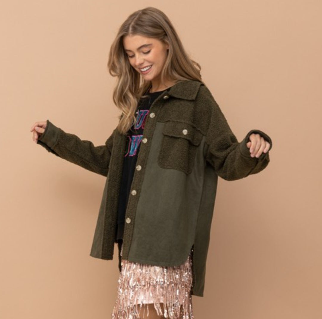 Elevate your wardrobe with the Olive Luxe Teddy Shacket, a perfect blend of comfort and sophistication. Designed with a soft suede-like finish and a hint of stretch, this oversized button-up offers both style and ease of movement. The rich dark olive hue adds a touch of elegance, making it versatile enough to dress up for a night out or keep it casual with leggings or jeans. Cozy, chic, and effortlessly timeless, this shacket is a must-have for any season.